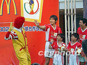 ![]() 麥當(dāng)勞日前在上海南京路世紀(jì)廣場舉行“體驗世足魅力,盡在麥當(dāng)勞”系列活動。圖為“麥當(dāng)勞叔叔”和以影星周星馳為首的小足球隊員在一起“比賽”。錢興強(qiáng) 攝