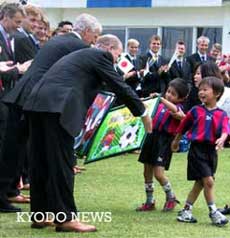 法國(guó)等5個(gè)世界杯參賽國(guó)相繼到達(dá)日本最后備戰(zhàn) 2002年05月21日 15:07 ![]() 丹麥代表隊(duì)抵達(dá)和歌山。在和歌山集訓(xùn)地向丹麥選手贈(zèng)送足球繪畫的幼兒園小朋友(共同社)