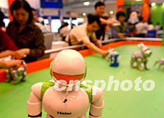 ![]() 各式各樣的機器人和機器寵物薈萃一個游戲臺,為二十三日開幕的北京國際科技產(chǎn)業(yè)博覽會助威。中新社記者 賈國榮 攝