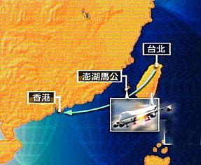 圖:臺(tái)灣墜?蜋C(jī)飛行路線示意圖 2002年05月25日 18:52 ![]() 鄭重聲明:關(guān)于臺(tái)灣華航飛機(jī)失事的新聞信息,系中新網(wǎng)特稿,未經(jīng)書面授權(quán),不得采用。