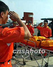 圖:臺(tái)灣搜救人員向空難遺體敬禮 2002年05月27日 11:31 ![]() 臺(tái)灣搜救人員向華航空難海域撈回的遇難者遺體敬禮致哀。中央社攝/中新社