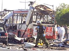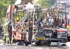 耶路撒冷市中心公共汽車爆炸案已有18人死亡(圖) 2002年06月18日 15:29 ![]() ![]() 被襲擊的公共汽車 中新網(wǎng)北京6月18日消息:以色列電視二臺18日報道說,耶路撒冷市中心當(dāng)日上午發(fā)生公共汽車自殺炸彈襲擊事件,造成17人死亡。 報道沒有說明死亡人數(shù)中是否包括自殺炸彈襲擊者本人。這起自殺性炸彈襲擊還造成車上32人受傷。 這輛公共汽車從耶路撒冷南郊的吉羅猶太人區(qū)開往市中心,當(dāng)時正是交通高峰時段。 阿克薩烈士旅宣稱對耶路撒冷公汽爆炸案負責(zé) 中新網(wǎng)北京6月18日消息:黎巴嫩真主黨游擊隊的電視臺18日接到匿名電話,此人聲稱“阿克薩烈士旅”對耶路撒冷爆炸案負責(zé)。 德新社援引該電視臺的報道說,這次炸彈襲擊是為了“阿克薩烈士旅”在伯利恒的領(lǐng)導(dǎo)人蘇布赫17日被殺而進行的報復(fù)。 耶路撒冷南部18日交通高峰時段發(fā)生公共汽車爆炸案,造成13人死亡,40人受傷,其中5人情況危急。 哈馬斯組織也聲稱對耶路撒冷公汽爆炸案負責(zé) 中新網(wǎng)北京6月18日消息:巴勒斯坦激進的“伊斯蘭抵抗運動”(哈馬斯組織)18日宣稱對耶路撒冷公共汽車爆炸案負責(zé)。 有人給法新社打去匿名電話,聲稱哈馬斯組織的軍事派別“卡薩姆旅”實施了這次行動。 另據(jù)報道,黎巴嫩真主黨游擊隊的電視臺也接到匿名電話,此人聲稱“阿克薩烈士旅”對耶路撒冷爆炸案負責(zé)。 耶路撒冷市中心18日交通高峰時段發(fā)生公共汽車爆炸案,造成17人死亡,約30人受傷。 沙龍親臨耶路撒冷爆炸現(xiàn)場拒談巴勒斯坦建國 中新網(wǎng)北京6月18日消息:在耶路撒冷市中心發(fā)生造成17人死亡的公汽爆炸案后,以色列總理沙龍18日拒絕巴勒斯坦建國。 據(jù)法新社報道,沙龍在事發(fā)現(xiàn)場對記者表示:“你還能談什么巴勒斯坦國家!边@是沙龍出任總理以來首次親往巴勒斯坦人自殺炸彈襲擊現(xiàn)場視察。 沙龍在數(shù)十名警察和保鏢的簇擁下表示:“我們今天見到的是巴勒斯坦恐怖主義,我們必須打擊這種恐怖主義,這也正是我們在做的! 美國官員最近提出建立臨時的巴勒斯坦國家的構(gòu)想,并通過談判確定其最終的形式。 18日的自殺性炸彈襲擊發(fā)生之際,美國總統(tǒng)布什正準(zhǔn)備宣布其中東和平新戰(zhàn)略。 耶路撒冷公汽爆炸案造成18名以色列人死亡 中新網(wǎng)北京6月18日消息:18日在耶路撒冷市中心,一名巴勒斯坦人在公共汽車上引爆炸彈,造成18名以色列人死亡,其中包括一些學(xué)童。 據(jù)法新社報道,醫(yī)院官員透露說,48名傷者正在接受治療,其中包括數(shù)名年齡在10到12歲之間的兒童。 報道還說,一名婦女在入院后不久就不治身亡,另外還有6名傷者的傷勢嚴重。 相關(guān)報道:耶路撒冷南部發(fā)生公車爆炸 13人死亡40人受傷
