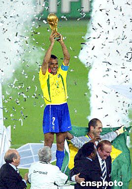組圖:德國0:2巴西 卡福高舉大力神金杯 2002年06月30日 21:41 ![]() ![]() 6月30日晚,2002韓日世界杯決賽巴西隊(duì)VS德國隊(duì)的比賽已經(jīng)結(jié)束,最終巴西隊(duì)以2比0戰(zhàn)勝德國隊(duì),羅納爾多表現(xiàn)出色獨(dú)進(jìn)兩球。圖為巴西隊(duì)隊(duì)長卡福高舉大力神金杯。