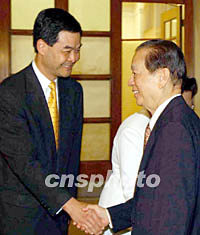 圖:慶祝晚宴上錢其琛與梁振英握手 2002年06月30日 22:14 ![]() 六月三十日,國務院副總理錢其琛在香港出席特區(qū)政府成立五周年慶祝晚宴時與行政會議召集人梁振英握手。潘索菲 攝