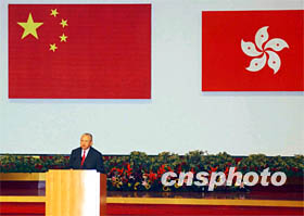 ![]() 7月1日上午,董建華宣誓就任香港特區(qū)第二屆政府行政長(zhǎng)官后發(fā)表致辭。中新社傳真 任晨鳴 攝