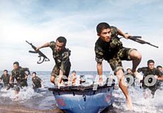 圖:解放軍沖鋒舟武裝搶灘登陸演習(xí) 2002年08月03日 17:28 ![]() 沈陽軍區(qū)官兵今夏在東北某海域進(jìn)行水上多項(xiàng)軍事課目訓(xùn)練,演習(xí)武裝搶灘登陸,向既定目標(biāo)快速挺進(jìn)。作者:馬檣