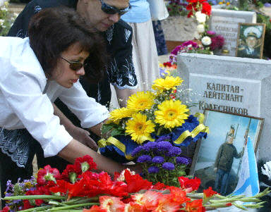 圖:莫斯科紀(jì)念"庫(kù)爾斯克號(hào)"核潛艇失事兩周年 2002年08月12日 22:36 ![]() 俄羅斯首都莫斯科12日舉行“庫(kù)爾斯克號(hào)”核潛艇失事兩周年紀(jì)念儀式,為118名死難者而設(shè)的紀(jì)念碑在莫斯科揭幕,幾十名海員及遇難者親友沉痛悼念葬身大海的海軍官兵。圖為遇難者家屬在紀(jì)念碑前擺放鮮花。