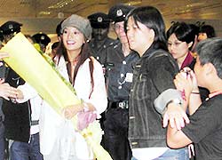 兩大機(jī)場(chǎng)搭客大廈皆出動(dòng)多名保安,但縱觀兩邊聲勢(shì),趙薇抵步時(shí),七八十名影迷洶涌而上,還得保安警察圍成人墻“護(hù)駕”。反之,前往為舒淇接機(jī)的影迷寥寥可數(shù),舒淇走得優(yōu)哉閑哉,意圖夾道的保安警察可謂英雄無(wú)用武之地。
