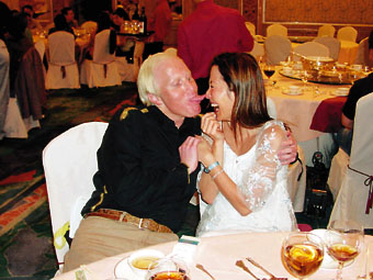 吃過了一兩道菜,楊紫瓊便逐臺去敬酒,還很豪氣要好事成雙,每人連飲兩杯。記者所見,楊紫瓊一個(gè)人也飲了差不多十支紅酒。鐘再思見女友如此高興,也拿出數(shù)碼相機(jī)拍下女友的豪情場面。楊紫瓊飲到略帶醉意,剛巧Star TV的高層在旁,他正表演伸長舌頭頂上鼻尖,楊紫瓊也學(xué)他。結(jié)果對方的舌頭頂?shù)剿谋羌,場面十分搞笑?/p>