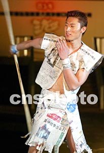一名中國內(nèi)地男模展示自己用報(bào)紙制作的個(gè)性時(shí)裝,別開生面。毛建軍 攝
