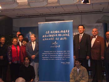 江澤民主席的題詞是:這是一位在中國(guó)抗日戰(zhàn)場(chǎng)英勇獻(xiàn)身的美國(guó)飛行員,中國(guó)人民將永遠(yuǎn)記住他的名字:吉米.福克斯。