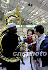 22日,美國芝加哥軍樂隊一早來到奧黑爾機場,準備迎接中國國家主席江澤民來訪,一名樂手與兩歲的中國小女孩互致問候。作者:王瑤