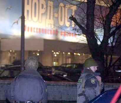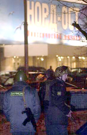 莫斯科時(shí)間23日晚間(北京時(shí)間24日凌晨),大約40-50名車臣武裝分子劫持了莫斯科市一家劇院,將700多人扣為人質(zhì),已經(jīng)釋放部分人質(zhì)。圖為警察在劇院外警戒。(春風(fēng))