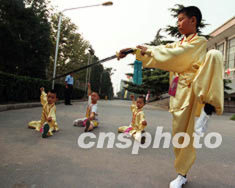 幾位湖北少年在秋日的陽光下集體練劍術修武功。熒屏武打片的盛行和許多父母希望自己的獨生子女少點任性軟弱、多點陽剛等原因,致使中國各地練武的少年越來越多。作者:王麗南