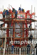 北京市政工程人員三十日在北京長安街上安裝宮燈,迎接即將召開的中共第十六次全國代表大會。作者:毛建軍