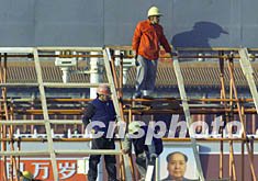 北京工人們十月底在天安門廣場安裝大型字牌,準(zhǔn)備迎接中共十六大的召開。作者:滿會喬