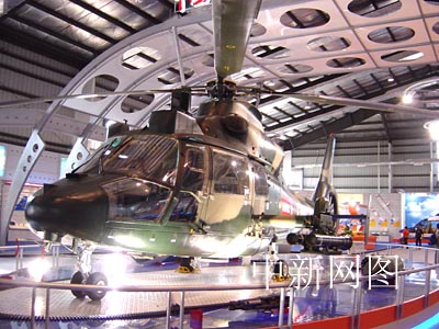 航空二集團(tuán)的其展區(qū)突出位置展示一架國產(chǎn)直-9武裝直升機(jī).