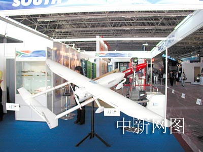 與上屆航展相比,南非的展臺(tái)此次增大了許多,但展品還是一樣,白色的是南非生產(chǎn)的無(wú)人機(jī)。