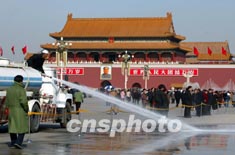 清潔工人四日用高壓水車沖刷北京天安門廣場(chǎng),創(chuàng)造優(yōu)良環(huán)境,迎接即將召開的中國(guó)共產(chǎn)黨第十六次全國(guó)代表大會(huì)。作者:毛建軍