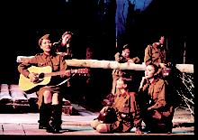 導演將這出戲定位為“詩化現(xiàn)實主義戰(zhàn)爭劇”,并用觀賞性很強的俄羅斯歌舞來調劑原本凝重慘烈的氣氛。既有表現(xiàn)女兵青春形象的歡快的歌曲,也有烘托戰(zhàn)爭殘酷的悲傷曲調,更有象征俄羅斯精神的激昂旋律。