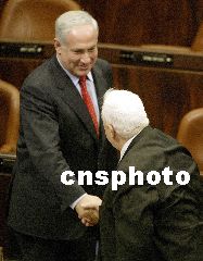 11月6日,內(nèi)塔尼亞胡正式就任沙龍重新組閣后的以色列新內(nèi)閣外長。圖為內(nèi)塔尼亞胡在宣誓就職后,與總理沙龍握手致意。Ic/cnsphoto 攝