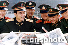 黨的十六大勝利召開引起部隊官兵的廣泛關(guān)注,連日來,武警南京市支隊充分利用每天“聽廣播、讀報、看新聞聯(lián)播”三個“半小時”時間,及時組織部隊收聽收看黨的十六大會議報道,激勵青年官兵立足軍營建功立業(yè)的豪情壯志,永遠做黨和人民的忠誠衛(wèi)士。圖為11月9日午休后,八中隊中隊長婁曙光(圖中)組織戰(zhàn)士們閱讀當(dāng)天報紙。中新社傳真 吳俊攝