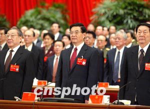 朱镕基與胡錦濤出席十六大閉幕會(huì)