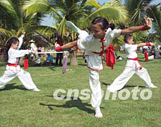 海南島?谑械那嗌倌陿I(yè)余武術(shù)訓(xùn)練中心的小朋友表演武術(shù),為中共十六大閉幕起舞助興。作者:王辛莉
