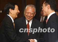 在香港出席世界會計師大會的中國國務院總理朱镕基,11月19日在會見香港特首董建華的特設國際顧問時與董建華和香港工商及科技局局長唐英年交談。任晨鳴 攝