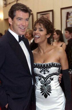11月18日,皮爾斯·布魯斯南(左)與奧斯卡影后哈莉·貝瑞在倫敦皇家艾伯特大廳參加邦德新片《明日再會》的世界首映式。哈莉·貝瑞在片中飾演"邦德女郎"。
