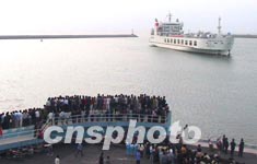 中國第一艘跨海火車輪渡“粵海鐵一號”,25日上午已經(jīng)停泊在粵海鐵路通道南港防波堤外,預(yù)計下午進入南港開始與船、橋、港對接。海南百姓聚集在碼頭上等待粵海鐵一號與海南土地的第一次親密接觸。作者:關(guān)向東