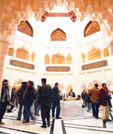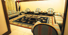 這個名為“蘇朱德”的薩達姆官邸占地面積龐大,裝飾著精美圖案的厚重鐵門正對著官邸主樓。在通向主樓的柏油路兩邊是開滿鮮花的花園和碧綠的草坪。這個三層高的拱型建筑內(nèi)部裝修豪華氣派,在八面體的墻上都雕刻著贊美薩達姆的詩句。天花板上垂下來巨大的枝型水晶吊燈。大廳旁邊還擺放著一張長方形的大餐桌。