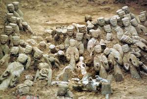 在長(zhǎng)9.7米、寬1.9米的陪葬坑內(nèi),展現(xiàn)在世人眼前的是距今二千多年前的漢代王侯貴族車馬出行時(shí)的豪華陣容,只見(jiàn)最前一排是五匹陶制的高頭大馬,馬身上都騎著神態(tài)各異、栩栩如生的陶俑。