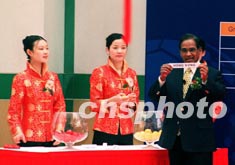 在祥和的中國民樂聲中,來自北京大學(xué)的女大學(xué)生將印有中國香港、中國澳門和中國臺北三隊(duì)英文字樣的字條從玻璃碗中一一取出,“找到”了各隊(duì)的組別位置。這三支球隊(duì)將分別參加第十三屆亞洲杯足球賽預(yù)賽第一階段D、E、B三組的比賽,爭取殺入第二階段預(yù)賽(既資格賽)。