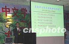 全美中文學(xué)校協(xié)會(huì)第四次全國(guó)代表大會(huì)十二月七日在芝加哥舉行,該會(huì)會(huì)員學(xué)校遍及美國(guó)四十一個(gè)州,學(xué)生五萬(wàn)多名。圖為會(huì)長(zhǎng)鄭良根在開(kāi)幕式上以《美國(guó)中文教育在新世紀(jì)里騰飛》為題作工作報(bào)告,介紹協(xié)會(huì)工作情況和華文教育在美國(guó)的迅速發(fā)展。作者:趙海燕