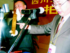 今天上午9點(diǎn),距離正式開拍還有一個(gè)小時(shí),設(shè)在成都人和賓館會議室里的拍賣現(xiàn)場已是人聲鼎沸,從全國各地趕來的多家媒體紛紛搶占有利地形,而“競拍席”上的買家則在最后時(shí)刻才神秘亮相。此前記者獲知,組織此次拍賣的四川金通拍賣行一直對參與競拍的三家企業(yè)避而不談,只透露其中有著名電器銷售公司成都國美電器,而另兩家則是四川本省的企業(yè),但是在競拍現(xiàn)場記者注意到,只有代表成都國美電器的28號競買者比較活躍,而另外兩家企業(yè)的競買人卻出人意料地沒有舉牌參加競買,結(jié)果,在開場20分鐘后兩塊金錠就毫無懸念的以底價(jià)62萬元被拍出。