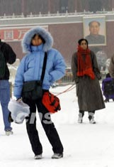 圖:少女全副裝備雪中游覽天安門廣場(chǎng)