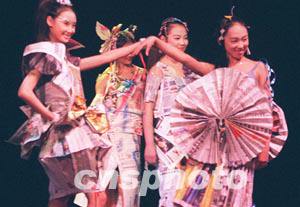 解放軍某部女兵歲末走上舞臺,精心演繹用舊報紙、床單、沙巾等制成的別致時裝,釋放愛美心緒。作者:宋吉河