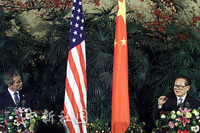 國(guó)家主席江澤民與美國(guó)總統(tǒng)布什二十一日在北京共同會(huì)見中外記者,這是繼APEC上海峰會(huì)以來(lái)兩國(guó)元首第二次共同會(huì)見記者。作者:滿會(huì)喬