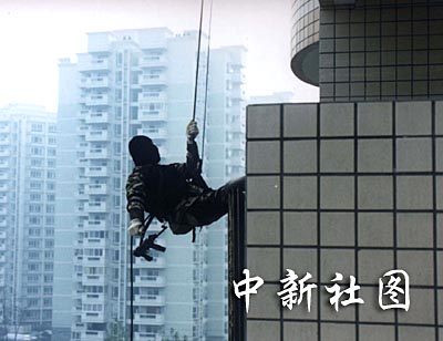26日,成都首次反恐怖演習。在處置恐怖分子對某跨國公司辦公大樓實施的劫持人質(zhì)的演習中,特警秘密潛入大樓,準備伺機行動。作者:劉真