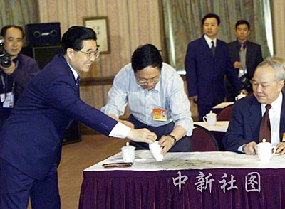 國家副主席胡錦濤在“兩會”期間看望參會的全國政協(xié)委員時,蔡義江委員不小心弄灑茶水,胡錦濤從自己桌上拿起毛巾幫他擦拭。作者:滿會喬