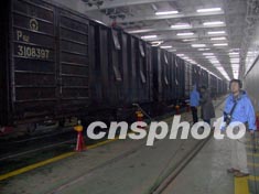 一月七日粵海鐵路火車輪渡將正式開通,今天在最后的試運(yùn)行中,鐵道部領(lǐng)導(dǎo)親自見證了火車開進(jìn)粵海鐵巨大的船艙。關(guān)向東 攝