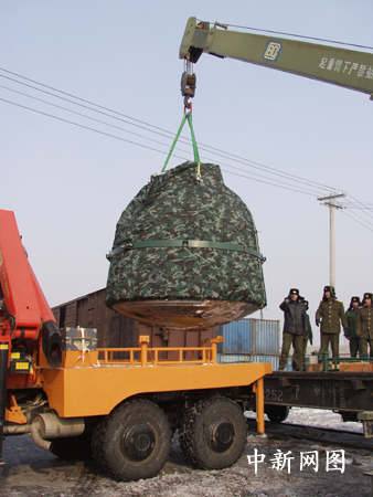 返回艙吊裝上專用列車,沿鐵路駛往北京。孫陽 攝