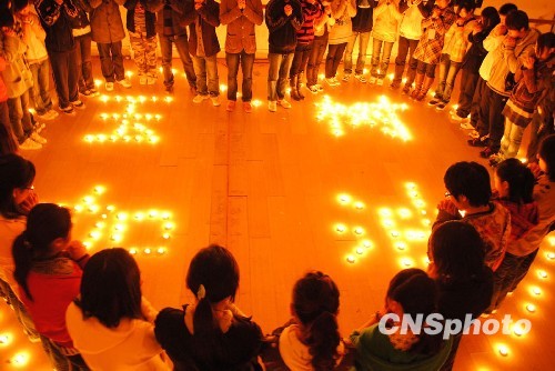 大學(xué)生點燃孔明燈為玉樹災(zāi)區(qū)人民祈福