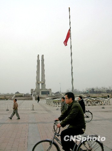 河北唐山抗震紀(jì)念碑廣場下半旗志哀