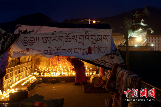青海格薩爾王廣場(chǎng)點(diǎn)起酥油燈為逝者祈禱