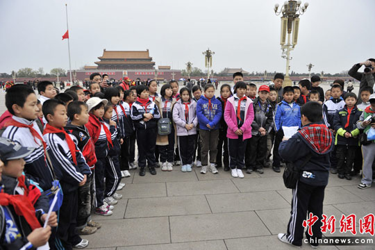 小學(xué)生在天安門廣場(chǎng)悼念地震遇難者