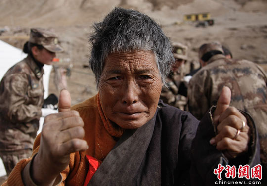藏族老阿媽向抗震醫(yī)療隊(duì)員豎大拇指