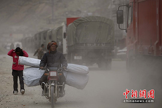 青海玉樹(shù)地震:領(lǐng)取救災(zāi)物品的受災(zāi)民眾行走在塵土中