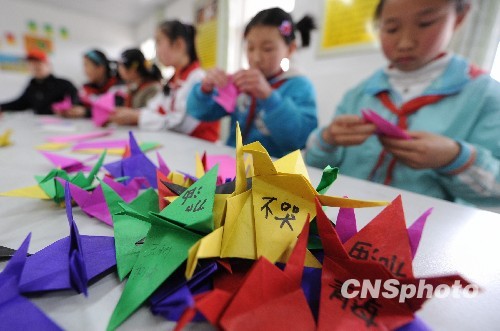 江蘇揚(yáng)州:疊千紙鶴 為玉樹(shù)祈福
